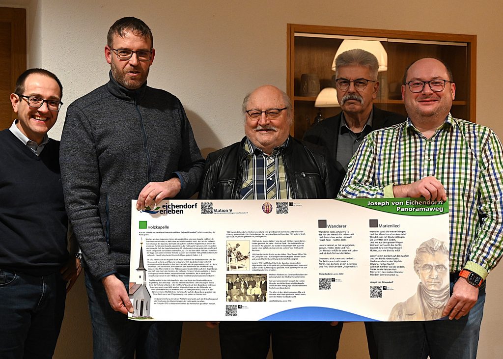 Dieses Jahr wurde die Station 22 des Joseph-von-Eichendorff-Panoramaweges umgesetzt, so Gehwolf weiter. Unter Federführung von Schriftführer Ulrich Altmann wurden die drei Tafeln hierfür gestaltet und von Mitgliedern der Eichendorfer Kirchenverwaltung und des Eichendorf Pfarrgemeinderates bei der Pfarrkirche St. Martinus in Eichendorf aufgestellt. Tatkräftige Unterstützung bei diesem Projekt erfährt der Verein besonders durch Markus Maidl aus Hartkirchen, der sein Wissen als Mediengestalter größtenteils ehrenamtlich in den Dienst der Sache stellt, Helmut Dietl aus Badersdorf, der aus seinem reichhaltigen Archiv viele alte Fotografien, Postkarten und historisches Textmaterial zur Verfügung stellt und Paul Streifeneder aus Eichendorf, der tatkräftig mitarbeitet und literarisch unterstützt. Ziel des Projektes sei es nicht so der Vorsitzende, den Weg in kürzester Zeit „hinzuklotzen“, sondern die einzelnen Stationen des Weges behutsam unter aktiver Beteiligung der Eichendorf(f)-Begeisterten zu entwickeln. Alle Anwesenden waren sich einig, dass sich in nächster Zeit zu diesem Zweck wieder die Tore der Ideenwerkstatt öffnen, als nächstes steht die Station „Holzkapelle“ auf dem Plan. Wer sich hierzu beteiligen möchte oder selbst eine gute Idee hat und diese verwirklichen möchte, kann sich jederzeit bei der Vorstandschaft melden und Teil der Gemeindeentwicklung werden.